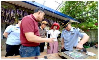 進入5月,北京市著名的櫻桃產(chǎn)區(qū)——通州區(qū)西集鎮(zhèn)的萬畝櫻桃即將成熟。近日,通州區(qū)市場監(jiān)督管理局和通州區(qū)計量檢測所的工作人員走進櫻桃種植戶中間,為他們使用的電子秤提供集中上門檢定服務(wù),以精準(zhǔn)計量守護消費者合法權(quán)益,護航特色農(nóng)業(yè)高質(zhì)量發(fā)展。圖為工作人員向種植戶發(fā)放宣傳頁,提示大家誠信經(jīng)營,杜絕電子秤作弊行為。