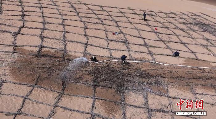 (資料圖)圖為工人鋪設(shè)草方格沙障。阿拉善宣傳部供圖