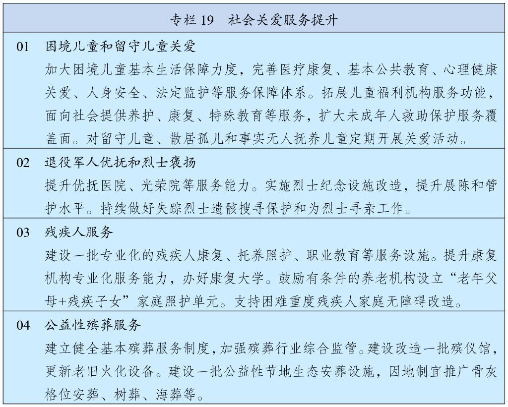深化退役軍人管理保障改革,完善組織管理、工作運行和政策制度體系。健全優(yōu)撫待遇確定和調(diào)整機制,加強優(yōu)待項目統(tǒng)籌管理,完善退役軍人幫扶援助和法律服務體系。深化優(yōu)撫醫(yī)院、光榮院管理改革,完善優(yōu)撫醫(yī)療康養(yǎng)體系。推進退役軍人高質(zhì)量安置就業(yè),完善安置辦法,強化政策支持和服務指導。健全退役軍人榮譽激勵和表彰獎勵制度。加強和改進雙擁模范創(chuàng)建工作。大力弘揚英烈精神。