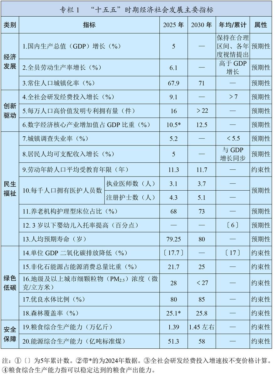 新發(fā)展理念引領作用全面彰顯,構建新發(fā)展格局邁出重要步伐,新質(zhì)生產(chǎn)力穩(wěn)步發(fā)展,高質(zhì)量發(fā)展扎實推進。經(jīng)濟運行穩(wěn)中有進,國內(nèi)生產(chǎn)總值突破140萬億元,現(xiàn)代化產(chǎn)業(yè)體系建設取得重大進展,基礎設施支撐能力不斷提升,數(shù)字經(jīng)濟核心產(chǎn)業(yè)增加值占比超過10.5%,城鄉(xiāng)區(qū)域發(fā)展平衡性協(xié)調(diào)性增強??萍紕?chuàng)新成果豐碩,全社會研發(fā)經(jīng)費投入強度達到2.8%,攻克一批重大關鍵核心技術,取得一批重大原創(chuàng)科技成果。全面深化改革進一步推進,落實“兩個毫不動搖”的體制機制不斷完善,全國統(tǒng)一大市場建設取得積極成效,宏觀經(jīng)濟治理效能進一步提升。高水平對外開放不斷擴大,開放型經(jīng)濟新體制加快形成,高質(zhì)量共建“一帶一路”走深走實。全過程人民民主深入發(fā)展,全面依法治國有效實施。文化事業(yè)和文化產(chǎn)業(yè)蓬勃發(fā)展,精神文化產(chǎn)品豐富多彩。民生保障扎實穩(wěn)固,居民人均可支配收入年均增長5.4%,城鎮(zhèn)新增就業(yè)累計達到6242萬人,勞動年齡人口平均受教育年限達到11.3年,人均預期壽命提升至79歲以上,脫貧攻堅成果鞏固拓展。綠色低碳轉型步伐加快,生態(tài)環(huán)境質(zhì)量持續(xù)改善,非化石能源發(fā)電裝機容量超過化石能源,地級及以上城市細顆粒物(PM2.5)濃度降至28微克/立方米,地表水達到或好于Ⅲ類水體比例超過90%,森林覆蓋率超過25%。國家安全能力有效提升,糧食產(chǎn)量邁上1.4萬億斤大臺階,社會治理效能增強,社會大局保持穩(wěn)定。國防和軍隊建設取得重大進展?!耙粐鴥芍啤睂嵺`深入推進。中國特色大國外交全面拓展。全面從嚴治黨成效顯著,反腐敗斗爭縱深推進,黨的創(chuàng)造力、凝聚力、戰(zhàn)斗力明顯提高。