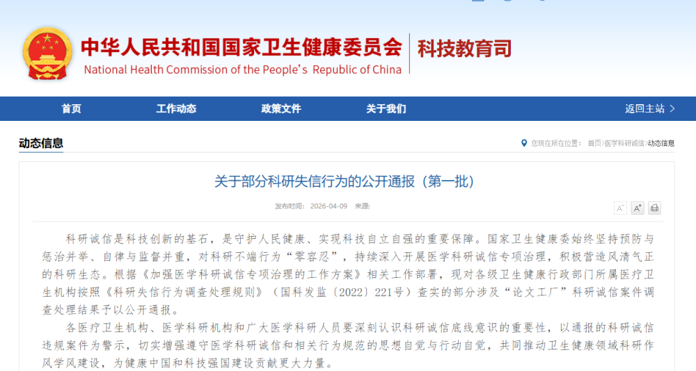 科研誠信是科技創(chuàng)新的基石,是守護人民健康、實現(xiàn)科技自立自強的重要保障。國家衛(wèi)生健康委始終堅持預(yù)防與懲治并舉、自律與監(jiān)督并重,對科研不端行為“零容忍”,持續(xù)深入開展醫(yī)學(xué)科研誠信專項治理,積極營造風(fēng)清氣正的科研生態(tài)。根據(jù)《加強醫(yī)學(xué)科研誠信專項治理的工作方案》相關(guān)工作部署,現(xiàn)對各級衛(wèi)生健康行政部門所屬醫(yī)療衛(wèi)生機構(gòu)按照《科研失信行為調(diào)查處理規(guī)則》(國科發(fā)監(jiān)〔2022〕221號)查實的部分涉及“論文工廠”科研誠信案件調(diào)查處理結(jié)果予以公開通報。