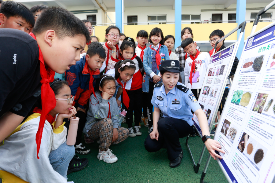 5月26日,浙江省岱山縣公安局民警來到轄區(qū)蓬山小學開展“共建無毒家園 守護紅色根脈”主題宣傳活動。其間,民警向?qū)W生講解了植物類、食品飲料類及其他類18種國家實行整類列管的新精神活性物質(zhì)相關知識,并開展禁毒拼圖、擊碎毒品等互動游戲,進一步提高學生們識毒、防毒、拒毒意識。圖為民警向?qū)W生講解禁毒知識。