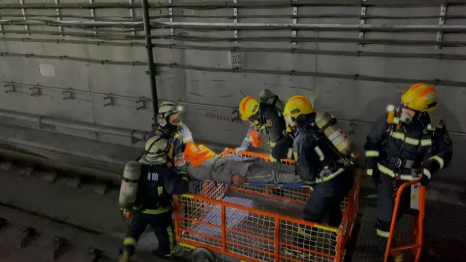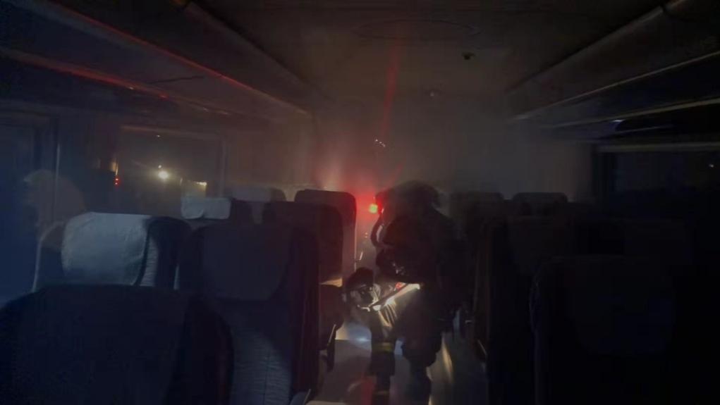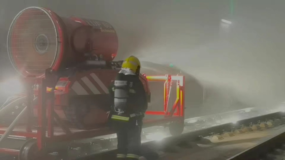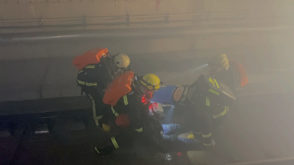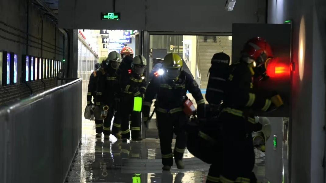 1月21日1時(shí),演練正式開(kāi)始。一列由大興新城地鐵站開(kāi)往草橋站的地鐵因動(dòng)力電機(jī)故障導(dǎo)致電氣線路起火燃燒,高溫?zé)煔庋杆傧蜍?chē)廂內(nèi)蔓延,造成大量乘客被困。發(fā)生火災(zāi)后,大興新城地鐵站值班人員確認(rèn)事故后,立即啟動(dòng)應(yīng)急處置預(yù)案,停運(yùn)就近線路列車(chē)運(yùn)行,并撥打119報(bào)警。地鐵工作人員利用應(yīng)急廣播向乘客播報(bào)情況穩(wěn)定乘客情緒,車(chē)站工作人員啟動(dòng)應(yīng)急處置,地鐵微型消防站趕赴站臺(tái),疏散站臺(tái)乘客,啟動(dòng)固定消防設(shè)施。119指揮中心接警后立即啟動(dòng)《北京市地鐵火災(zāi)事故滅火救援預(yù)案》,調(diào)集專(zhuān)業(yè)力量及社會(huì)聯(lián)動(dòng)單位到場(chǎng)協(xié)同處置。消防隊(duì)站到場(chǎng)后成立偵查組、搜救組、滅火組、照明組、排煙組、保障組等多個(gè)小組,采取“接力疏散、陣地堵截、控?zé)熃禍亍钡燃紤?zhàn)術(shù)措施;搜救組在水槍掩護(hù)下進(jìn)入內(nèi)部偵察火情并優(yōu)先搜救被困人員,啟動(dòng)接力疏散戰(zhàn)術(shù);滅火組采取“排煙散熱、開(kāi)辟通道、雙向搜救、分段作業(yè)”等技戰(zhàn)術(shù)措施,利用滅火機(jī)器人、干式泡沫對(duì)起火地鐵車(chē)輛進(jìn)行滅火處置;轄區(qū)應(yīng)急、公安、交通、環(huán)衛(wèi)、氣象、醫(yī)療等聯(lián)動(dòng)力量參與行動(dòng),提供外圍警戒、交通疏導(dǎo)、醫(yī)療保障等工作。1時(shí)35分,明火被撲滅,所有人員全部安全救出,人員得到妥善救助,綜合演練圓滿結(jié)束。