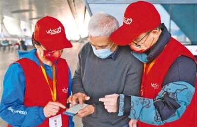 1月18日,鐵路志愿者在杭州火車東站幫助老年旅客在線申請(qǐng)電子臨時(shí)乘車身份證明。竇瀚洋 湯鑫嚴(yán)攝影報(bào)道
