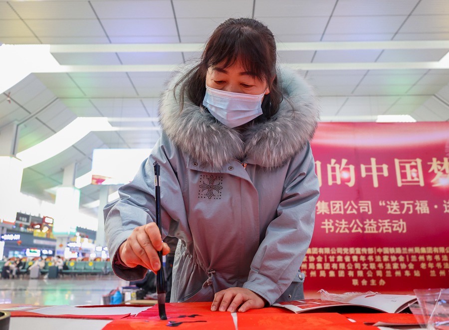 為實(shí)現(xiàn)“平安春運(yùn)、有序春運(yùn)、溫馨春運(yùn),讓旅客體驗(yàn)更美好”的春運(yùn)目標(biāo),1月25日蘭州鐵路局在蘭州火車站、蘭州西站開(kāi)展了以“我們的中國(guó)夢(mèng)”為主題的“送萬(wàn)福·進(jìn)萬(wàn)家”書(shū)法公益活動(dòng)?;顒?dòng)當(dāng)天,甘肅省的20余名書(shū)法家、藝術(shù)家筆走龍蛇、揮毫潑墨,現(xiàn)場(chǎng)創(chuàng)作春聯(lián)和“福”字,為候車旅客送上新春的祝福。