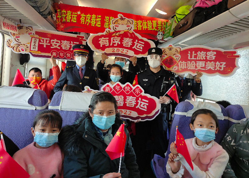 春運(yùn)以來(lái),烏魯木齊鐵路公安局庫(kù)爾勒公安處乘警支隊(duì)民警用情用心,認(rèn)真落實(shí)消防、安檢職責(zé),維護(hù)好列車秩序,為廣大旅客營(yíng)造一個(gè)安全、溫馨的乘車環(huán)境。圖為近日,由喀什發(fā)往成都的k454次列車車廂里,乘警帶領(lǐng)列車工作人員和乘客一起開(kāi)展春運(yùn)安全倡議活動(dòng)。