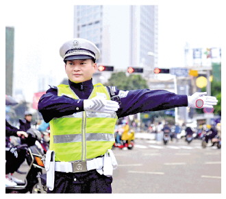 圖為王偉堅(jiān)守崗位指揮交通。