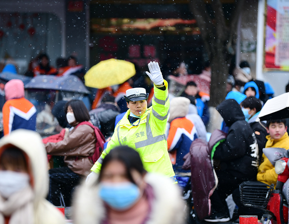 2月17日,安徽省阜南縣交警冒風(fēng)雪中在城區(qū)第一小學(xué)周邊路段護(hù)送學(xué)生放學(xué)。連日來,該縣中小學(xué)校陸續(xù)開學(xué),阜南縣公安局交管大隊(duì)啟動“護(hù)學(xué)崗”,疏導(dǎo)學(xué)校周邊交通秩序,確保道路暢通和師生上下學(xué)出行安全。