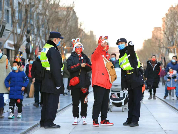 2022年春節(jié)期間,北京市公安局東城分局全體民警堅(jiān)守崗位,舍小家,為大家,全力保障轄區(qū)安全穩(wěn)定。圖為前門大街派出所民警在轄區(qū)巡邏,隨時(shí)為群眾提供幫助。