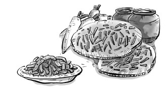 十來天后,母親將僵蟲一般的蘿卜條,放進沸水里焯一焯,一來祛除濃烈的生辣味兒,讓蘿卜條變得溫順、和氣一些;二來吸納一定的水分,使其變得滋潤、飽滿。瀝干水分后,母親將蘿卜條一股腦倒進盆里,加入細鹽、五香粉和八角等調(diào)料,然后用雙手攪勻,悉數(shù)裝入壇子,壓實,封口。