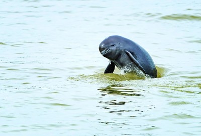 長江南京段,一頭長江江豚躍出水面。王臻琪攝/光明圖片