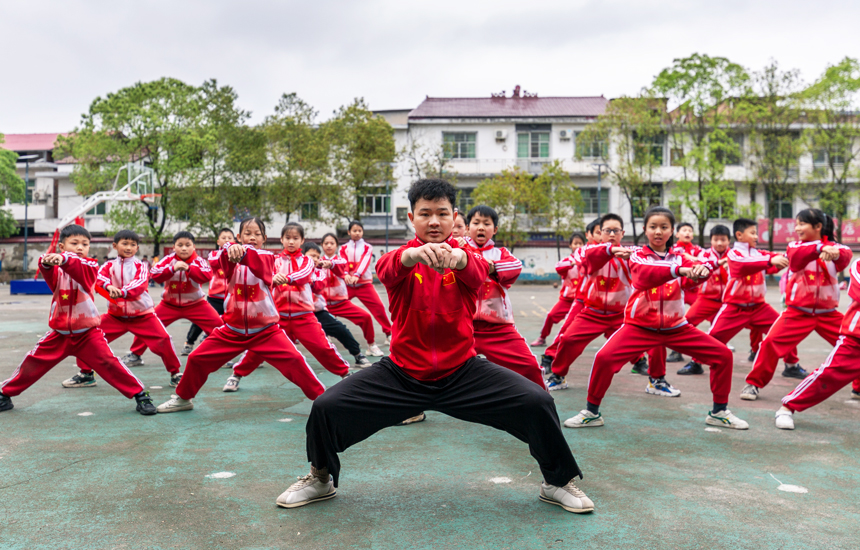 3月27日,上栗縣雞冠山中心小學(xué)武術(shù)社團(tuán)學(xué)生,正在教師帶領(lǐng)下開(kāi)展武術(shù)訓(xùn)練。楊娟攝