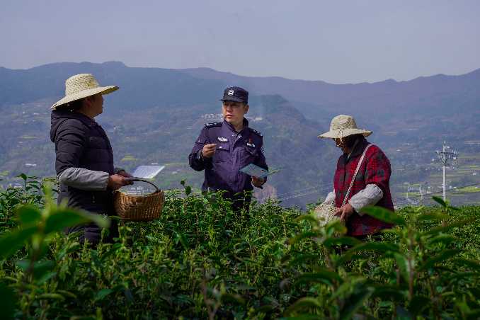 近日,湖北省宜昌市興山縣第一批春茶開始采摘。圖為3月27日,在興山縣峽口鎮(zhèn)普安村,峽口鎮(zhèn)派出所民警利用周末時(shí)間走進(jìn)茶園,宣傳防范電信網(wǎng)絡(luò)詐騙和農(nóng)村道路交通安全知識。 法治日報(bào)全媒體記者 劉志月 通訊員 王鵬程 攝