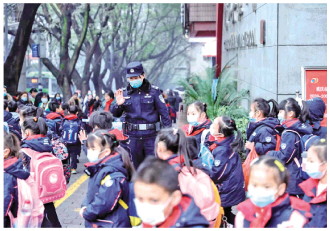 圖① 孫利護(hù)送孩子們放學(xué)。