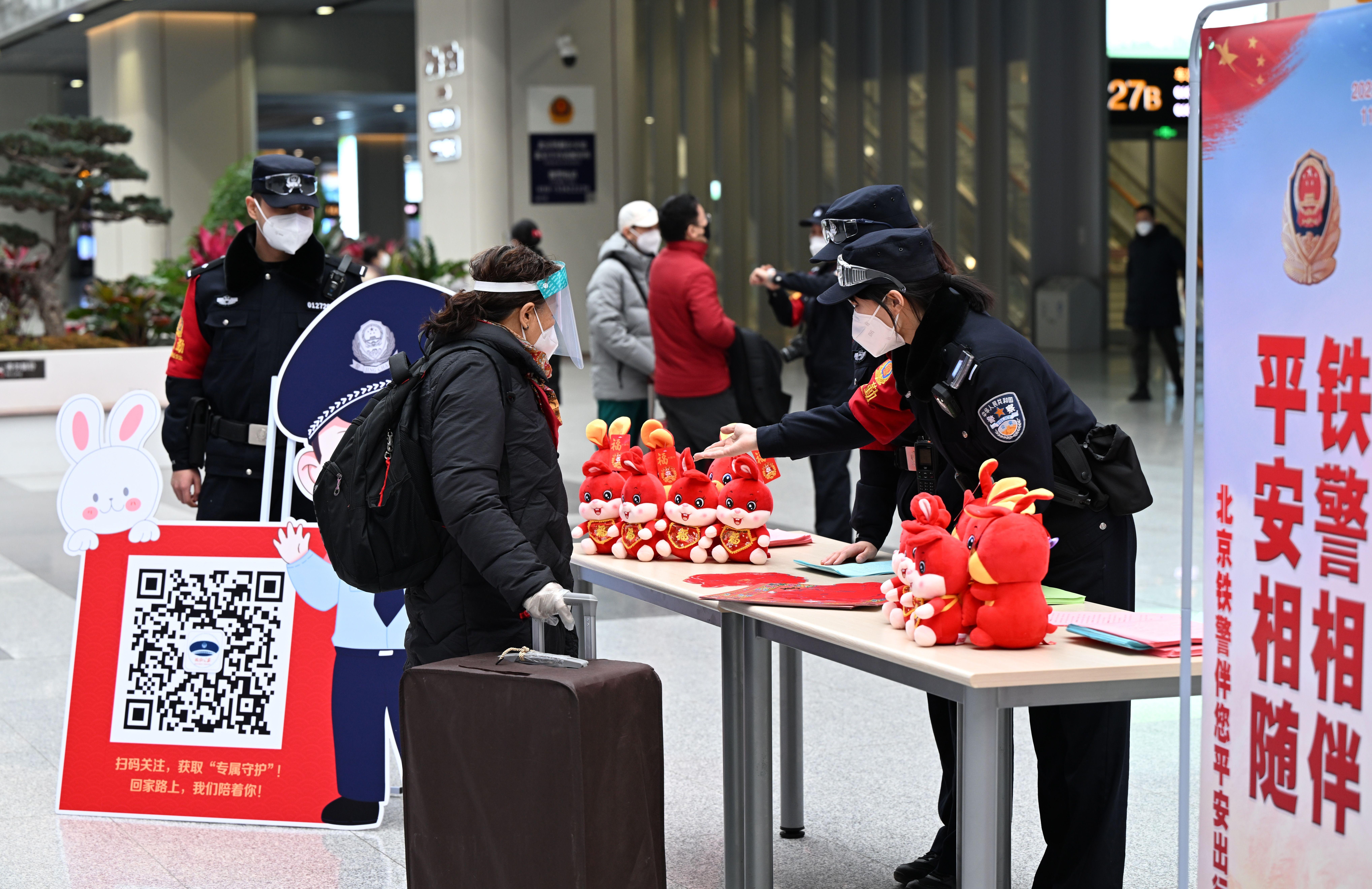 1月7日是春運(yùn)首日,北京鐵路警方在北京站、北京西站、北京南站、北京北站、北京豐臺站、北京朝陽站、清河站、張家口站、承德南站、廊坊站等10大客流集中的火車站同時開展了春運(yùn)安全宣傳活動。圖為豐臺站派出所民警在“鐵警相伴 平安相隨”宣傳活動展臺前,邀請旅客關(guān)注春運(yùn)便民服務(wù)措施“安全出行”二維碼。