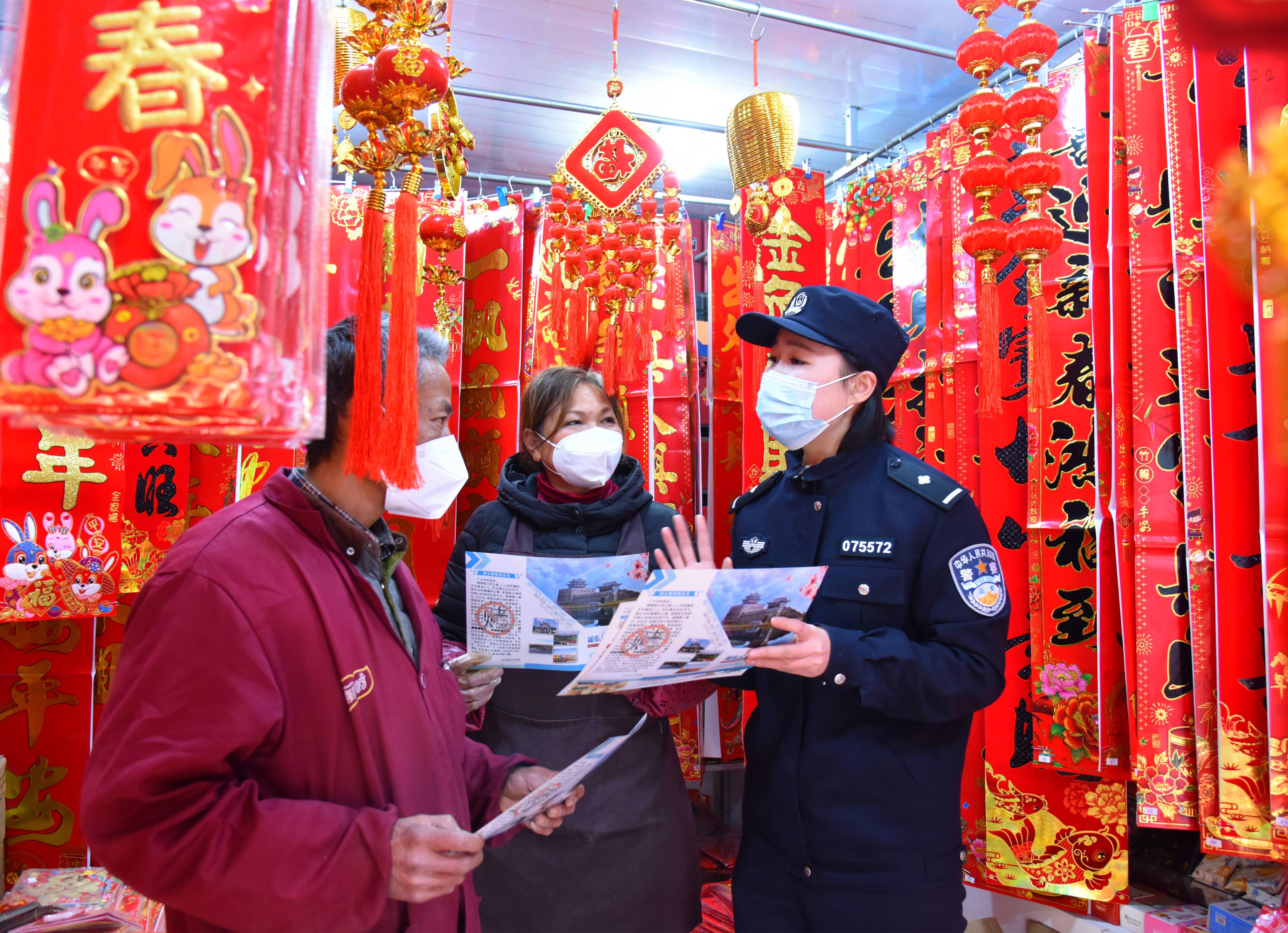 春節(jié)來(lái)臨,正值群眾購(gòu)置年貨的高峰期,安徽省當(dāng)涂縣公安局姑孰派出所民警深入轄區(qū)年貨市場(chǎng),向經(jīng)營(yíng)戶宣傳防火、防騙、防盜等平安常識(shí),全力守護(hù)轄區(qū)年貨市場(chǎng)平安繁榮,確保人民群眾歡度新春佳節(jié)。圖為1月4日,民警走訪年貨市場(chǎng)店主,開(kāi)展禁毒禁賭安全防范宣傳。