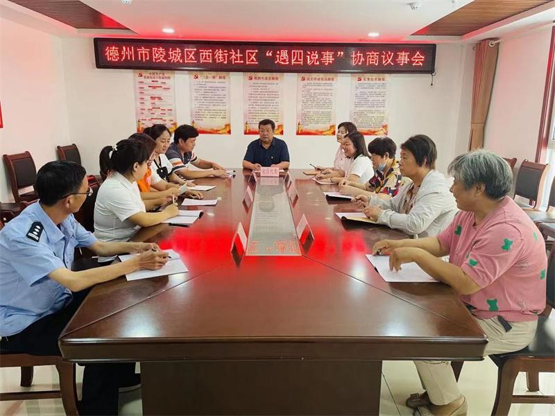 圖為陵城區(qū)建立“遇四說事”協(xié)商議事機制,每月4日、14日、24日由社區(qū)召集居民代表、業(yè)委會、物業(yè)召開會議,暢通問題反饋渠道,共商難題破解辦法