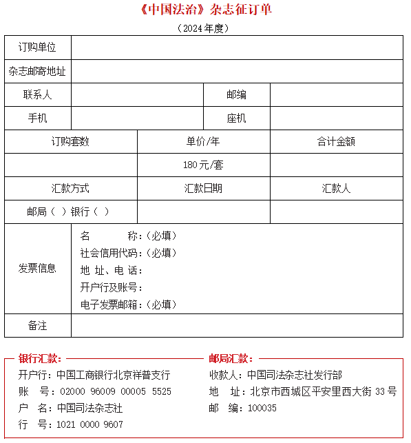 ★匯款時請務必標明“中國法治+訂購套數(shù)”,個人匯款另需注明“單位名稱”。