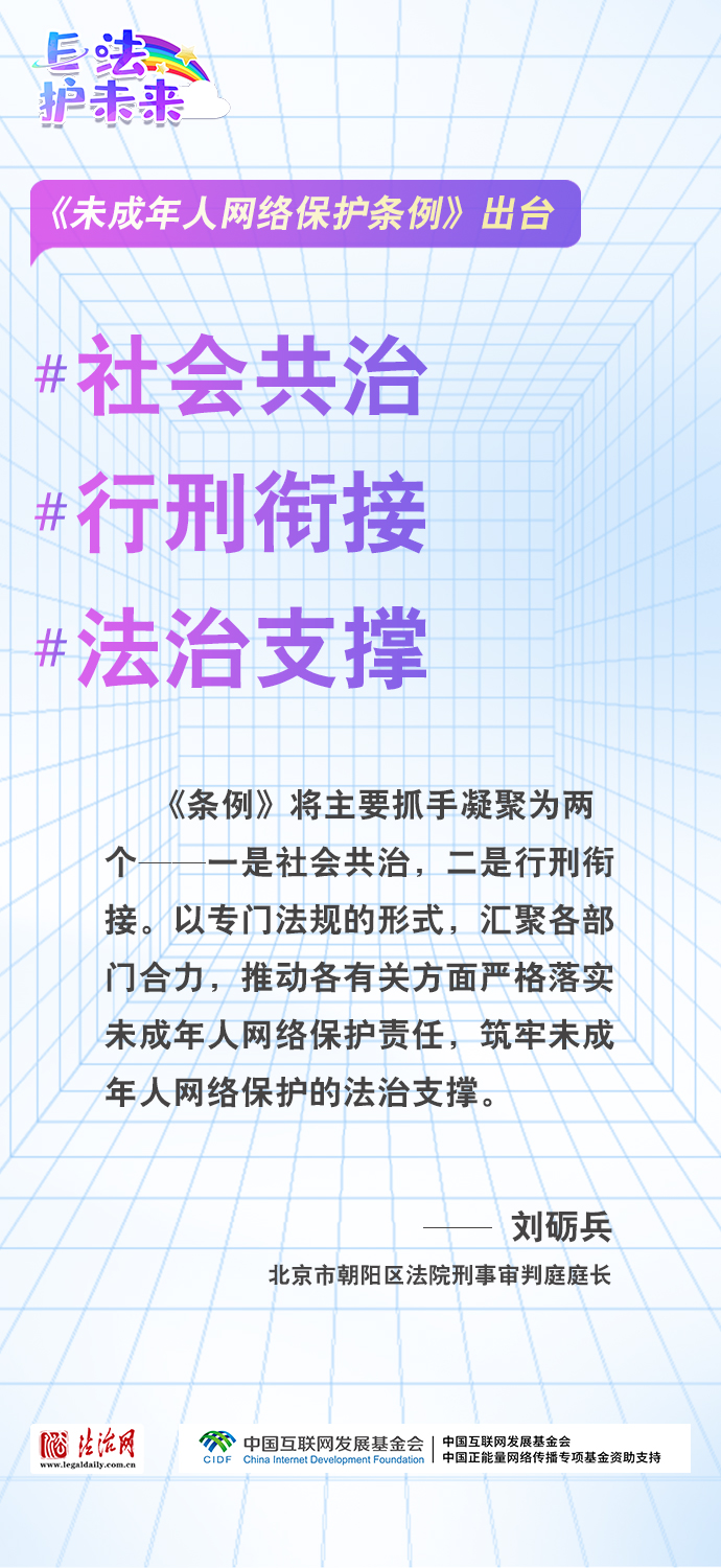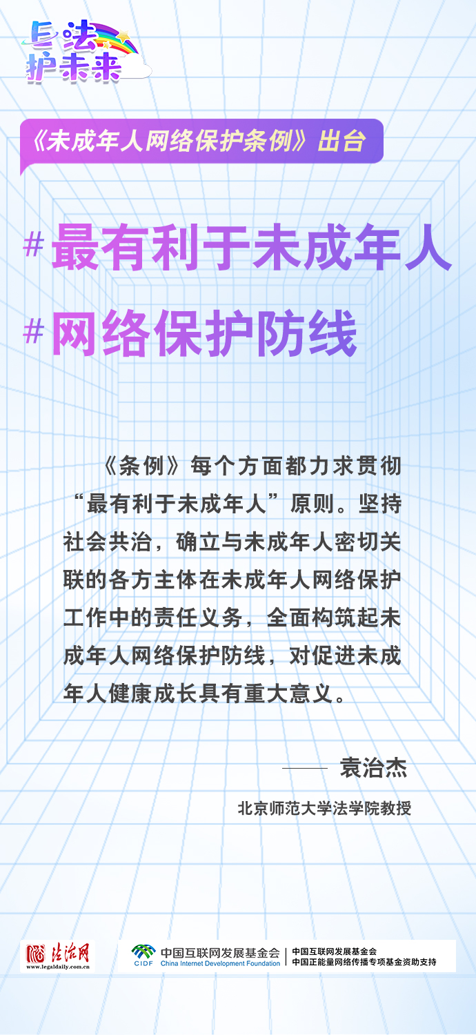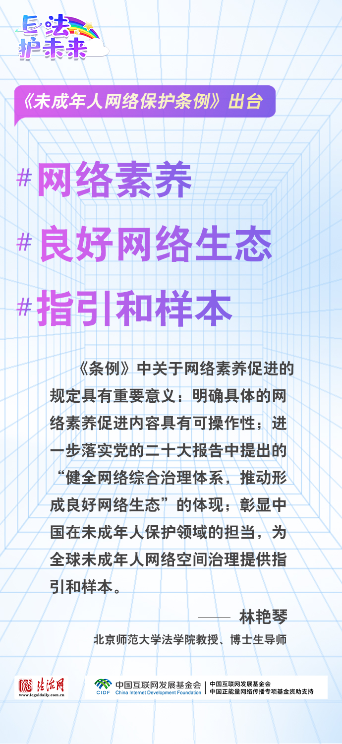法治網(wǎng)特推出一組“專家有言”海報(bào),內(nèi)容涵蓋《條例》出臺(tái)的現(xiàn)實(shí)意義和時(shí)代價(jià)值、網(wǎng)絡(luò)素養(yǎng)促進(jìn)、網(wǎng)絡(luò)信息內(nèi)容規(guī)范、個(gè)人信息網(wǎng)絡(luò)保護(hù)、網(wǎng)絡(luò)沉迷防治等,充分展現(xiàn)《條例》的出臺(tái)是我國(guó)互聯(lián)網(wǎng)治理領(lǐng)域的法治成果,彰顯中國(guó)在未成年人網(wǎng)絡(luò)保護(hù)領(lǐng)域的擔(dān)當(dāng),為全球未成年人網(wǎng)絡(luò)空間治理提供指引和樣本。