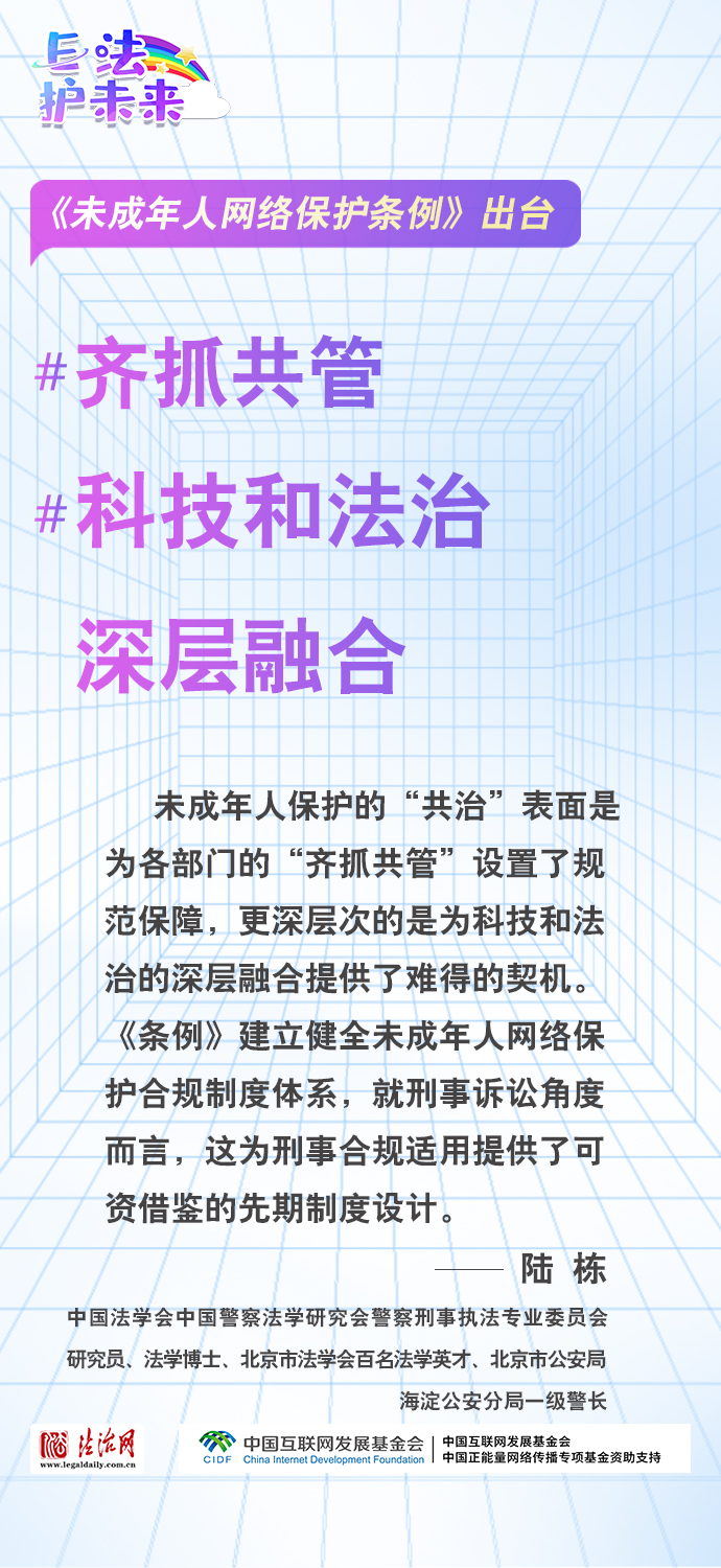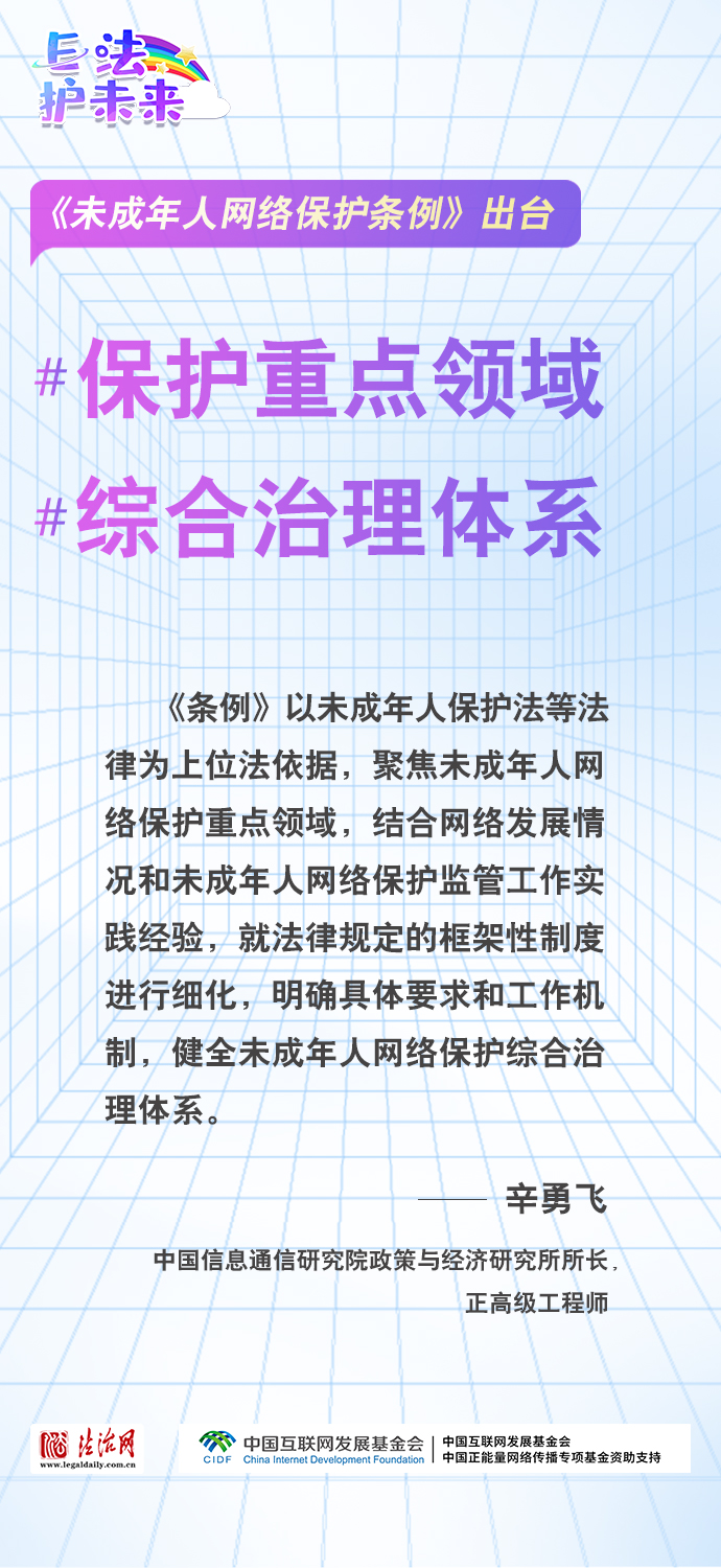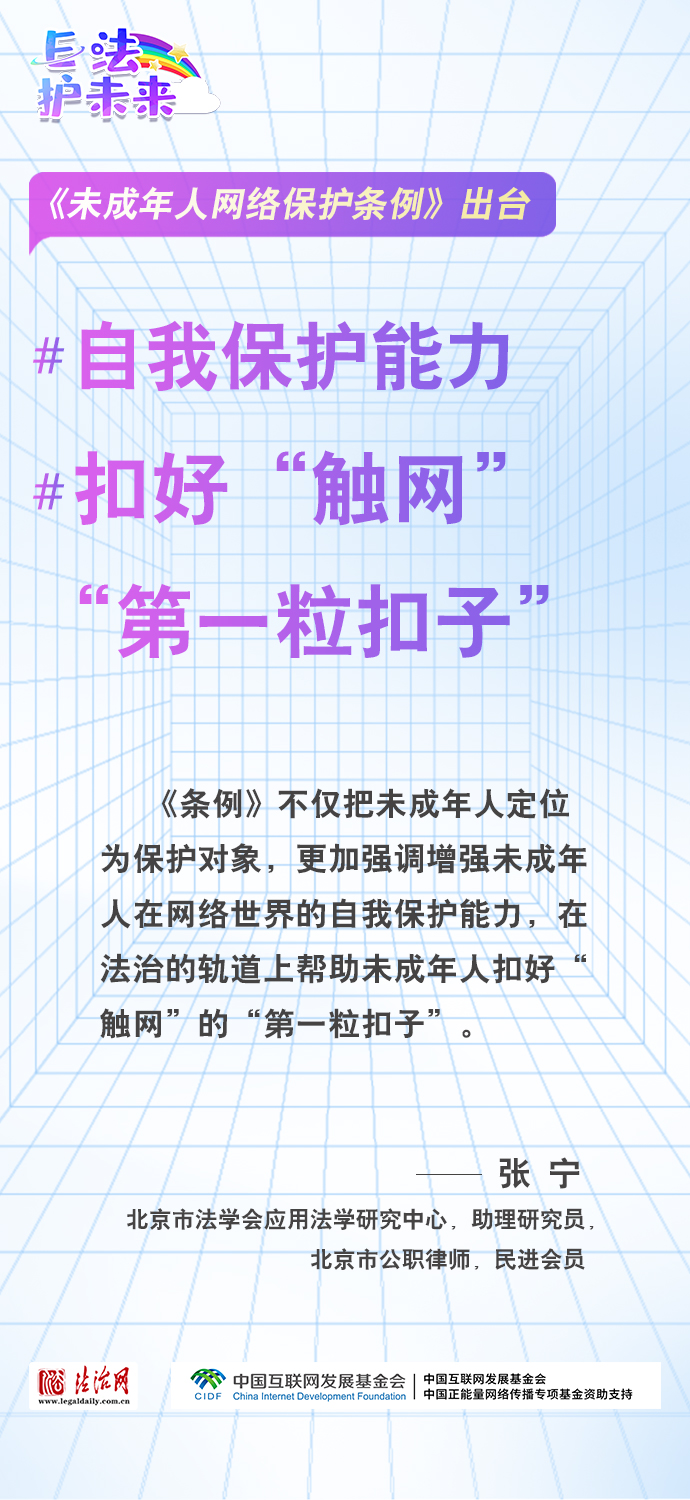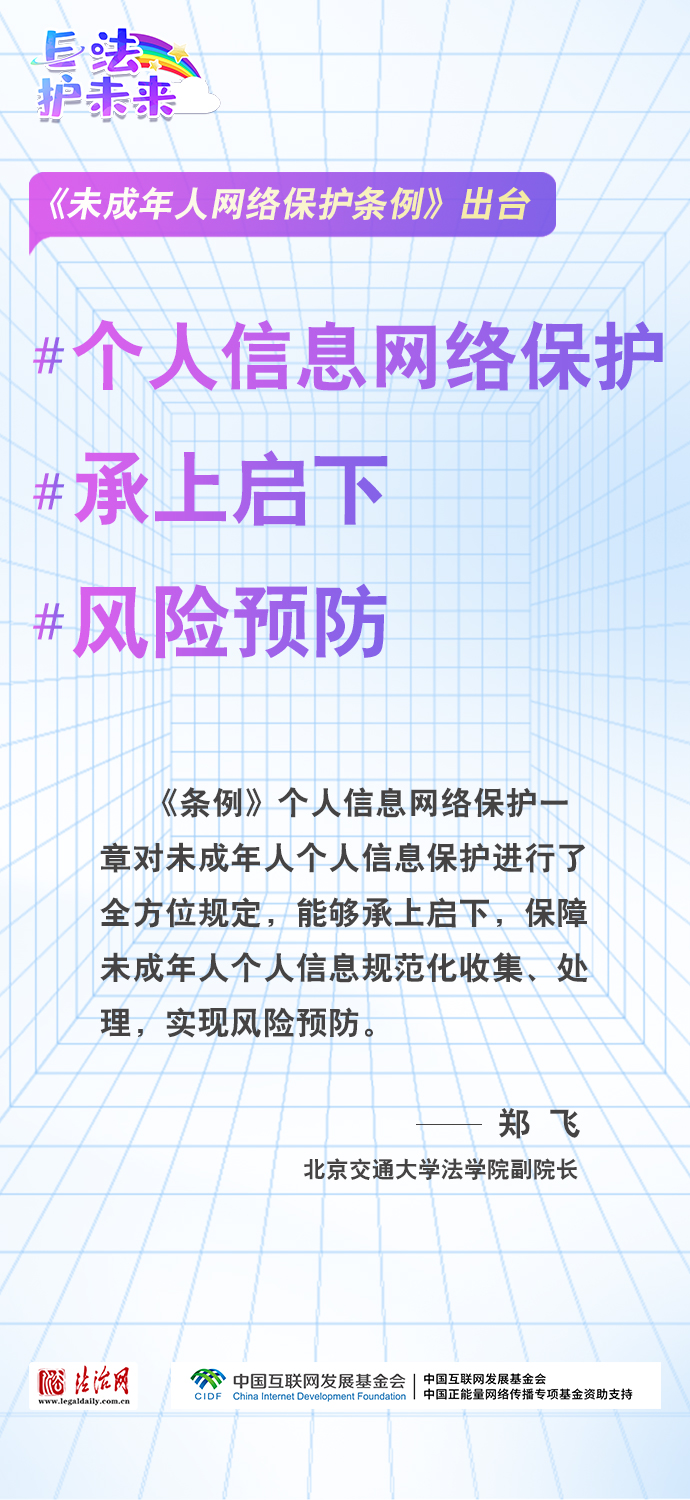 法治網(wǎng)特推出一組“專家有言”海報(bào),內(nèi)容涵蓋《條例》出臺(tái)的現(xiàn)實(shí)意義和時(shí)代價(jià)值、網(wǎng)絡(luò)素養(yǎng)促進(jìn)、網(wǎng)絡(luò)信息內(nèi)容規(guī)范、個(gè)人信息網(wǎng)絡(luò)保護(hù)、網(wǎng)絡(luò)沉迷防治等,充分展現(xiàn)《條例》的出臺(tái)是我國(guó)互聯(lián)網(wǎng)治理領(lǐng)域的法治成果,彰顯中國(guó)在未成年人網(wǎng)絡(luò)保護(hù)領(lǐng)域的擔(dān)當(dāng),為全球未成年人網(wǎng)絡(luò)空間治理提供指引和樣本。