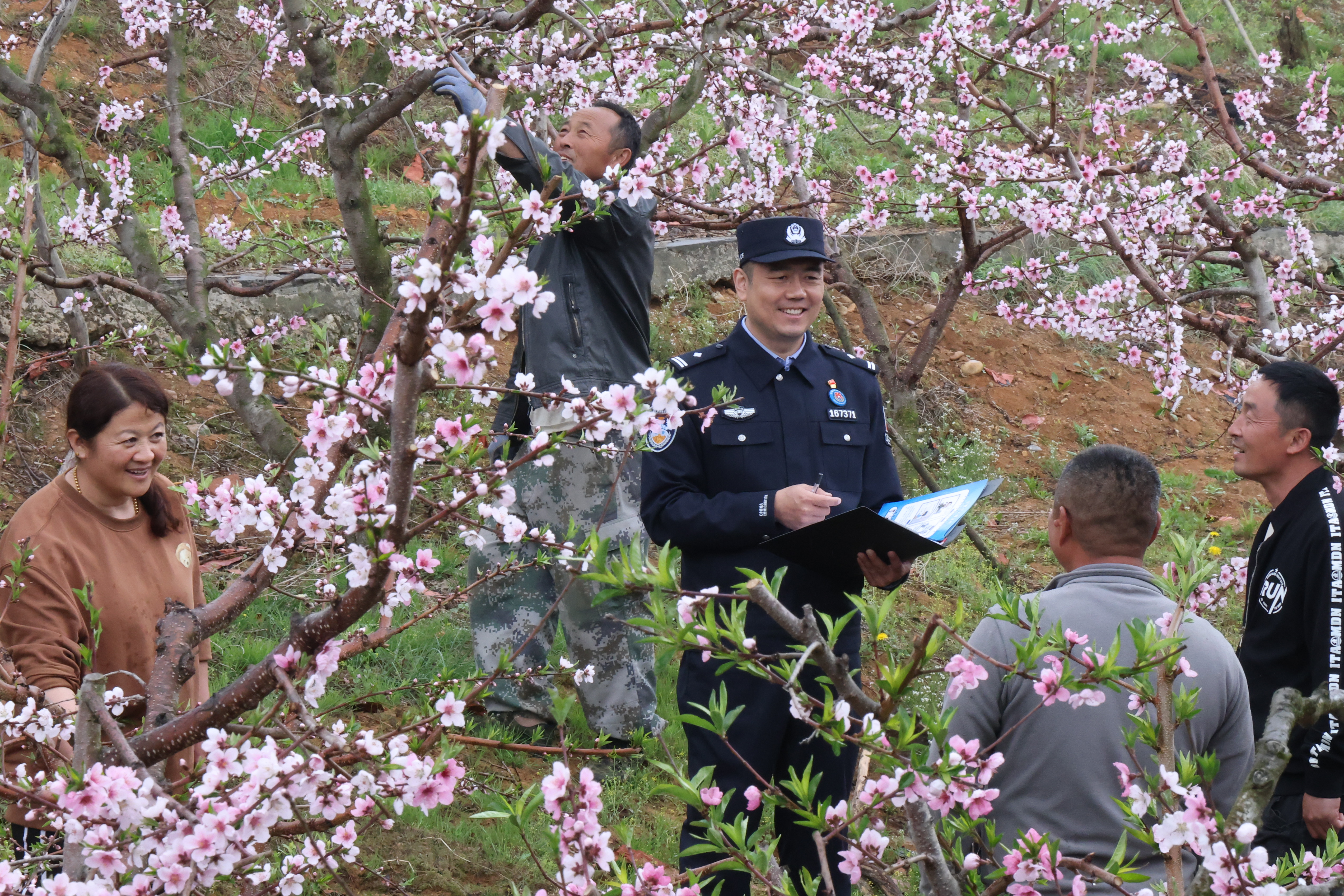 近日,遼寧出入境邊防檢查總站丹東邊境管理支隊大江口邊境派出所民警深入轄區(qū)桃花園,為桃農(nóng)開展反詐宣傳,守好群眾“錢袋子”。圖為民警走訪村民普及反詐常識。 本報通訊員 郝洪偉 攝