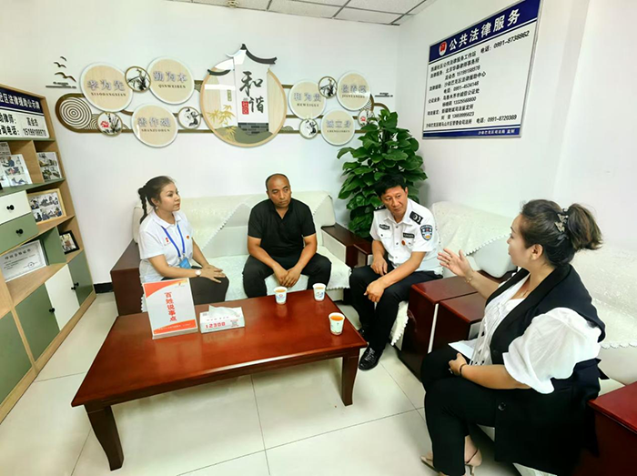 8月24日下午,在烏魯木齊市沙依巴克區(qū)騎馬山街道西盛社區(qū)“百姓說(shuō)事點(diǎn)”,街道司法所專職人民調(diào)解員楊新團(tuán)(右二)和社區(qū)人民調(diào)解員熱西旦·那斯?fàn)枺ㄗ笠唬┏晒φ{(diào)解一起鄰里之間因噪聲污染引發(fā)的矛盾糾紛。法治日?qǐng)?bào)全媒體記者 潘從武 攝