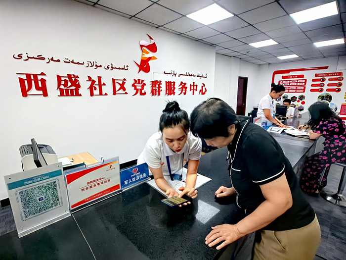 8月24日,烏魯木齊市沙依巴克區(qū)騎馬山街道西盛社區(qū)工作人員正在向轄區(qū)居民介紹“百姓說(shuō)事云·書(shū)記直通車”線上平臺(tái)的使用方法。法治日?qǐng)?bào)全媒體記者 潘從武 攝