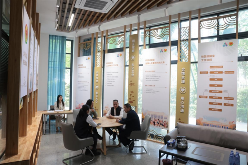 據(jù)了解,該校園調(diào)解室在龍華區(qū)司法局的指導(dǎo)下成立,是民治街道人民調(diào)解委員會(huì)推動(dòng)人民調(diào)解進(jìn)校園、打通“校調(diào)對(duì)接”最后一米,推進(jìn)矛盾化解在萌芽的有益探索。調(diào)解室整合多方資源組建了一支由街道調(diào)解員、青年律師、老師、家委等組成的專業(yè)調(diào)解隊(duì)伍,形成學(xué)校內(nèi)部解決筑基和專業(yè)力量并行助力的雙輪驅(qū)動(dòng)模式,達(dá)到“有場(chǎng)地、有牌子、有系統(tǒng)、有隊(duì)伍、有制度”的規(guī)范化建設(shè)標(biāo)準(zhǔn)。此外,校園調(diào)解室建立值班制度,要求青年律師、調(diào)解員定期到校值班,明確服務(wù)內(nèi)容、工作要求,為校園提供全面的法律服務(wù),做到矛盾糾紛早發(fā)現(xiàn)、早解決。