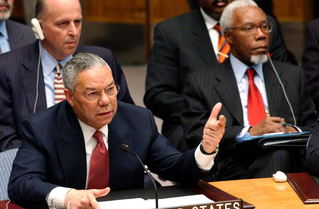 2003年2月5日,時(shí)任美國國務(wù)卿鮑威爾在聯(lián)合國安理會(huì)就伊拉克問題舉行的公開會(huì)議上向安理會(huì)通報(bào)有關(guān)伊拉克藏匿大規(guī)模殺傷性武器的所謂“證據(jù)”。 新華社記者彭張青攝(數(shù)碼傳真照片)