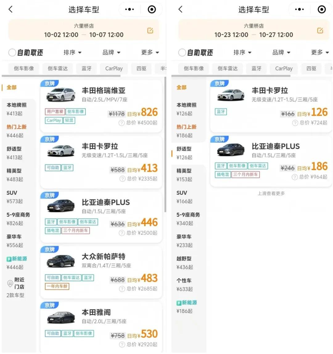 ▲某租車(chē)平臺(tái)國(guó)慶期間和節(jié)后租車(chē)價(jià)格對(duì)比。