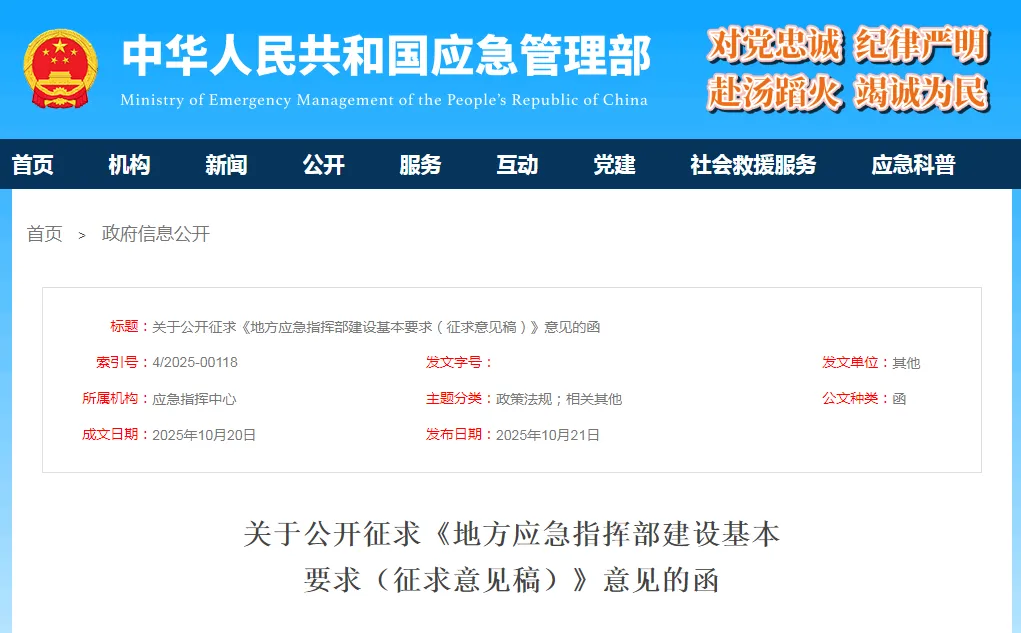 根據(jù)應(yīng)急管理部標(biāo)準(zhǔn)制修訂計劃安排,應(yīng)急管理部應(yīng)急指揮中心組織起草了《地方應(yīng)急指揮部建設(shè)基本要求(征求意見稿)》和編制說明(見附件1-2),現(xiàn)向社會公開征求意見。反饋意見請?zhí)顚憽稇?yīng)急管理標(biāo)準(zhǔn)項目征求意見表》(見附件3),并于2025年11月23日之前發(fā)送至電子郵箱591724758@qq.com。