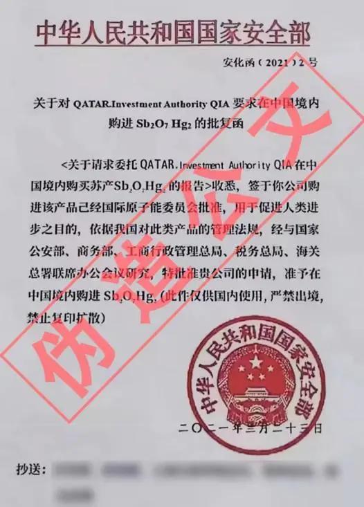 國(guó)家安全機(jī)關(guān)工作發(fā)現(xiàn),有不法分子偽造國(guó)家安全部等機(jī)關(guān)單位紅頭文件,以參與化學(xué)品“Sb2O7Hg2”(俗稱(chēng)“紅汞”)交易可獲利為名,精心編織騙局,誆騙群眾錢(qián)財(cái)。近日,國(guó)家安全機(jī)關(guān)會(huì)同相關(guān)部門(mén)破獲一起“紅汞騙局”案,現(xiàn)將騙術(shù)細(xì)節(jié)公之于眾,提醒廣大民眾增強(qiáng)防范意識(shí),守護(hù)好自己的“錢(qián)袋子”。