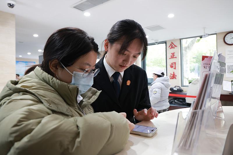 上海市長(zhǎng)寧區(qū)人民法院工作人員向群眾介紹人民法院在線服務(wù)全國(guó)版(微信小程序)使用方法