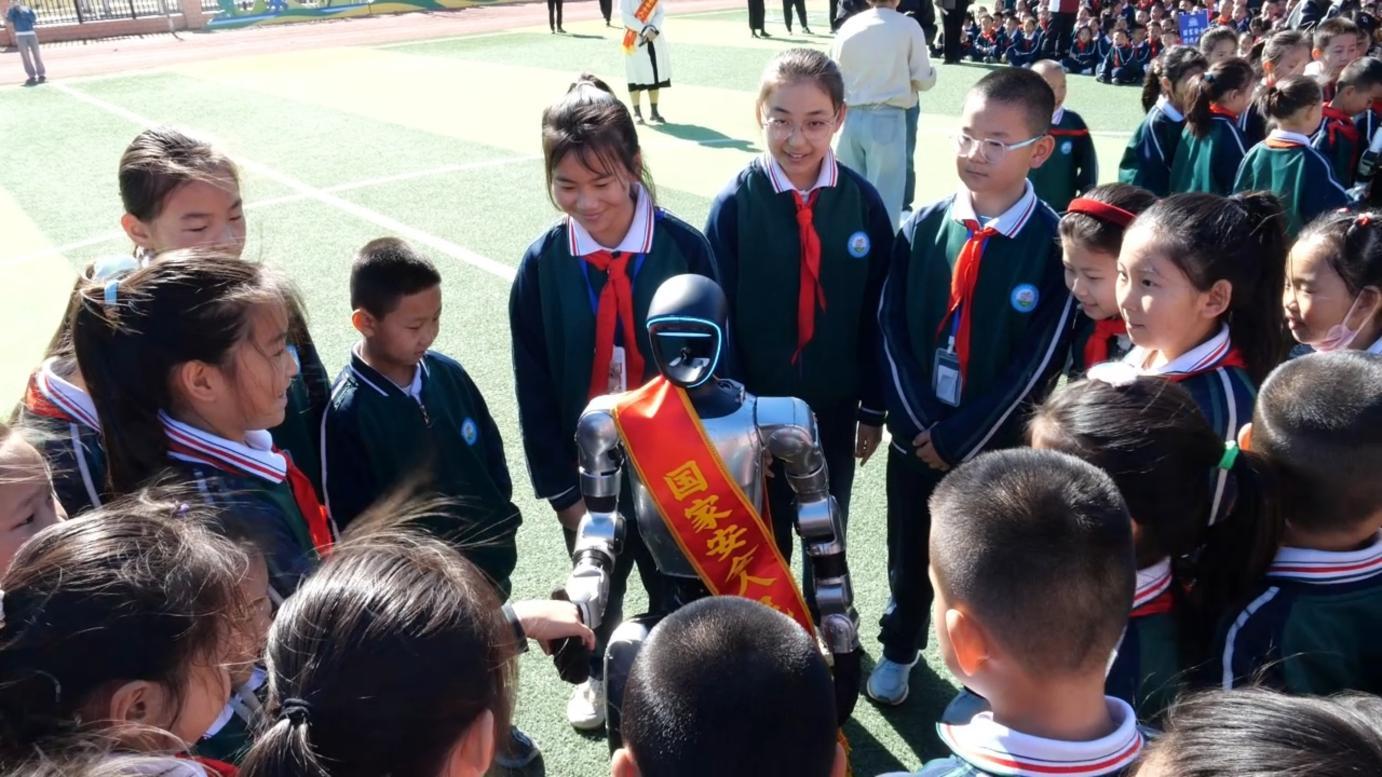 機(jī)器人與新疆生產(chǎn)建設(shè)兵團(tuán)第四師可克達(dá)拉市第一小學(xué)的同學(xué)們進(jìn)行互動(dòng)游戲。 許磊 攝