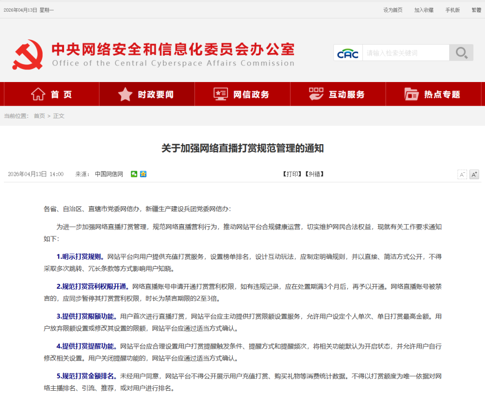 為進一步加強網絡直播打賞管理,規(guī)范網絡直播營利行為,推動網站平臺合規(guī)健康運營,切實維護網民合法權益,現(xiàn)就有關工作要求通知如下: