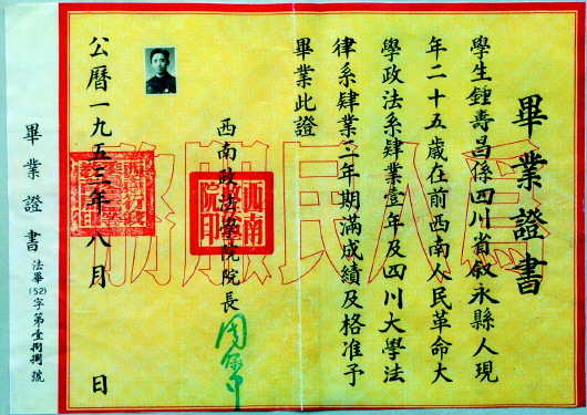西南政法學(xué)院第一張畢業(yè)證。