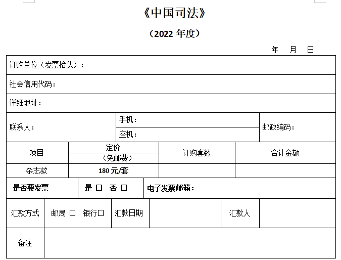 單位匯款時請務必標明“中國司法+訂購套數”,個人匯款請務必注明“單位名稱+中國司法”。
