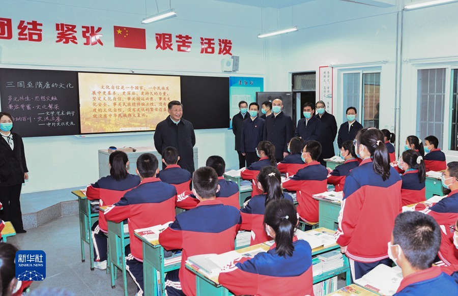 教學樓里,學生們正在上課。習近平走進高一(2)班教室,同師生親切交流,問同學們有什么理想,長大后想做什么。一位同學說將來想當李時珍那樣的醫(yī)生,另一位同學說想考大學藥劑專業(yè),還有一位同學說想學外語、將來當一名外交翻譯。習近平聽了十分高興,稱贊他們人生目標明確,理想高尚。他勉勵同學們從小樹立遠大理想,立志成為社會主義建設者和接班人,確保紅色基因代代相傳。