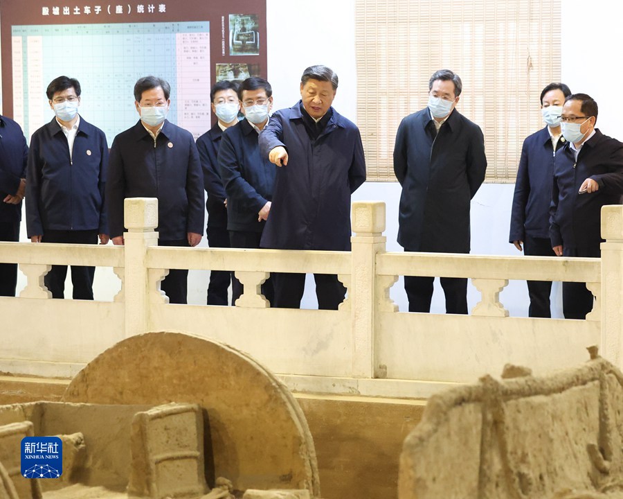 28日下午,習近平考察了位于安陽市西北郊洹河南北兩岸的殷墟遺址。殷墟是我國歷史上第一個文獻可考、為考古發(fā)掘所證實的商代晚期都城遺址。習近平步入殷墟博物館,仔細觀摩青銅器、玉器、甲骨文等出土文物。隨后,習近平來到車馬坑展廳,察看商代畜力車實物標本和道路遺跡。他指出,殷墟出土的甲骨文為我們保存3000年前的文字,把中國信史向上推進了約1000年。殷墟我向往已久,這次來是想更深地學習理解中華文明,古為今用,為更好建設中華民族現(xiàn)代文明提供借鑒。中國的漢文字非常了不起,中華民族的形成和發(fā)展離不開漢文字的維系。在這方面,考古事業(yè)居功至偉。考古工作要繼續(xù)重視和加強,繼續(xù)深化中華文明探源工程。中華文明源遠流長,從未中斷,塑造了我們偉大的民族,這個民族還會偉大下去的。要通過文物發(fā)掘、研究保護工作,更好地傳承優(yōu)秀傳統(tǒng)文化。習近平強調,中華優(yōu)秀傳統(tǒng)文化是我們黨創(chuàng)新理論的“根”,我們推進馬克思主義中國化時代化的根本途徑是“兩個結合”。我們要堅定文化自信,增強做中國人的自信心和自豪感。