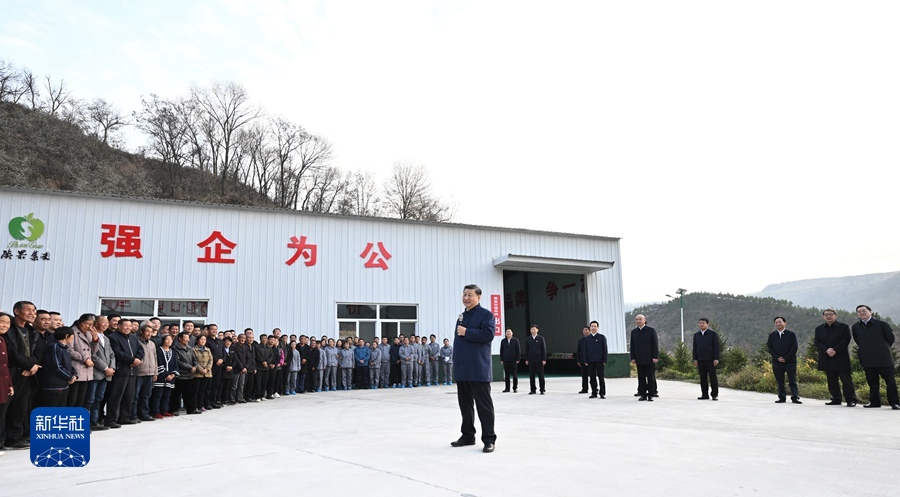 車間外,老鄉(xiāng)們聚集在一起,高聲向總書記問好。習近平同老鄉(xiāng)們拉起家常,回憶當年他在陜北的知青歲月。習近平對老鄉(xiāng)們說,我在陜北生活了7年,當年看到老鄉(xiāng)們生活很艱苦,心里就想著怎么樣讓大家生活好起來。這次來延安,看到一派碩果累累的豐收景象,交通條件大為改善,發(fā)生了翻天覆地的變化。過去陜北老鄉(xiāng)們修梯田、種莊稼,面朝黃土背朝天,掄起老鋤頭干活,廣種薄收,十分辛苦,如今山坡上退耕還林種上了蘋果,老鄉(xiāng)們有工作、有穩(wěn)定收入,孩子有好的教育,老人都有醫(yī)保,生活越來越好。從陜北的變化就可以看到中國的變化。習近平指出,現(xiàn)在,“兩個一百年”奮斗目標的第一個百年目標已經(jīng)實現(xiàn),絕對貧困問題解決了,老鄉(xiāng)們過上了好日子,但還要繼續(xù)努力往前走,讓生活越來越美好。陜北的氣候、光照、緯度、海拔等非常適宜發(fā)展蘋果種植,加上滴灌技術、矮化種植技術、選果生產線等不斷發(fā)展,就地賣出,銷路不愁,大力發(fā)展蘋果種植業(yè)可謂天時地利人和,這是最好的、最合適的產業(yè),大有前途。習近平強調,中國共產黨是人民的黨,是為人民服務的黨,共產黨當家就是要為老百姓辦事,把老百姓的事情辦好??照務`國,實干興邦。要認真學習貫徹黨的二十大精神,全面推進鄉(xiāng)村振興,把富民政策一項一項落實好,加快推進農業(yè)農村現(xiàn)代化,讓老鄉(xiāng)們生活越來越紅火。老鄉(xiāng)們爆發(fā)出雷鳴般的掌聲。