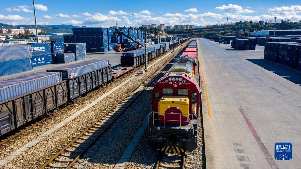 滿載30個(gè)標(biāo)準(zhǔn)集裝箱的中老鐵路新年首趟國際貨物列車??吭谥需F聯(lián)集昆明中心站(2022年1月1日攝,無人機(jī)照片)。新華社記者 胡超 攝