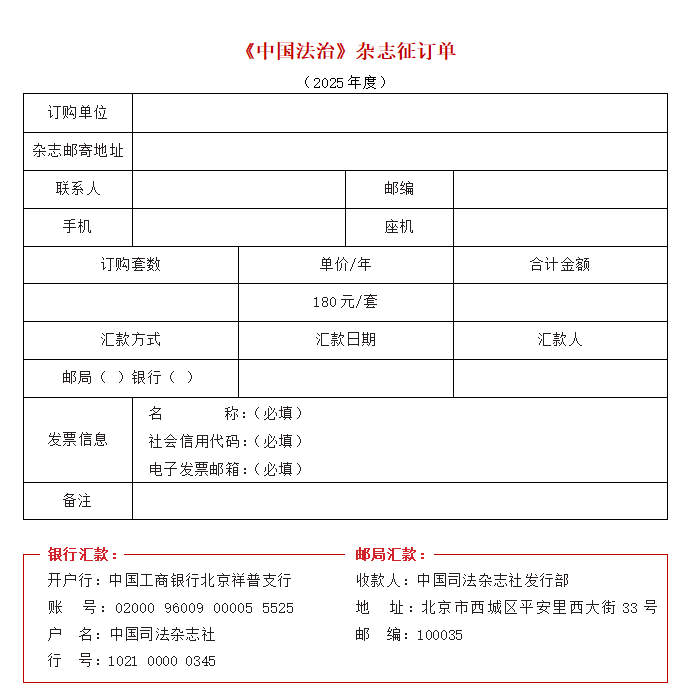 ★若不能進(jìn)行在線提交訂單,請(qǐng)將本征訂單填寫(xiě)完整后與匯款憑證一并發(fā)郵件至zgfzfxb@moj.gov.cn;或添加微信13671053926后發(fā)送電子版征訂單與匯款憑證。