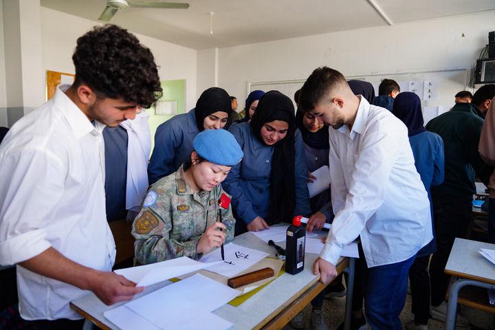 2023年4月3日,中國赴黎巴嫩維和多功能工兵分隊維和女兵韋薇在貝魯特拉赫曼·尤努斯中學用中文書寫學生名字。新華社發(fā)(李竹林攝)