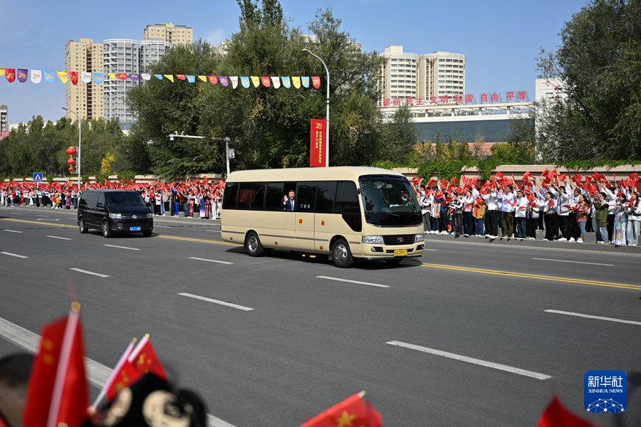 9月23日下午,中共中央總書記、國家主席、中央軍委主席習近平率中央代表團乘專機抵達烏魯木齊,出席新疆維吾爾自治區(qū)成立70周年慶?;顒?。這是從機場到住地途中,習近平向沿途歡迎的群眾揮手致意。新華社記者 辛悅衛(wèi) 攝