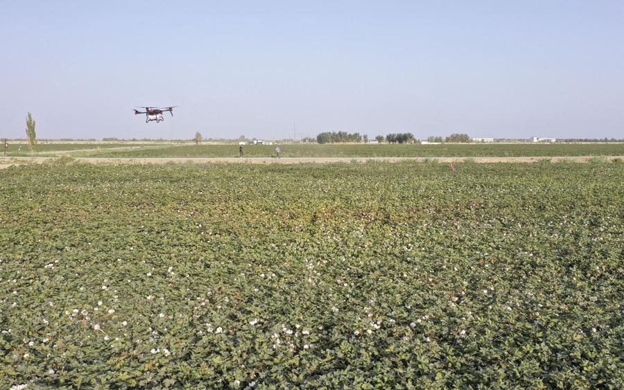 在新疆尉犁縣興平鎮(zhèn)達西村一處高標準農(nóng)田,種植戶用無人機噴灑脫葉劑(2022年9月20日攝,無人機照片)。新華社發(fā)(汪志鵬 攝)