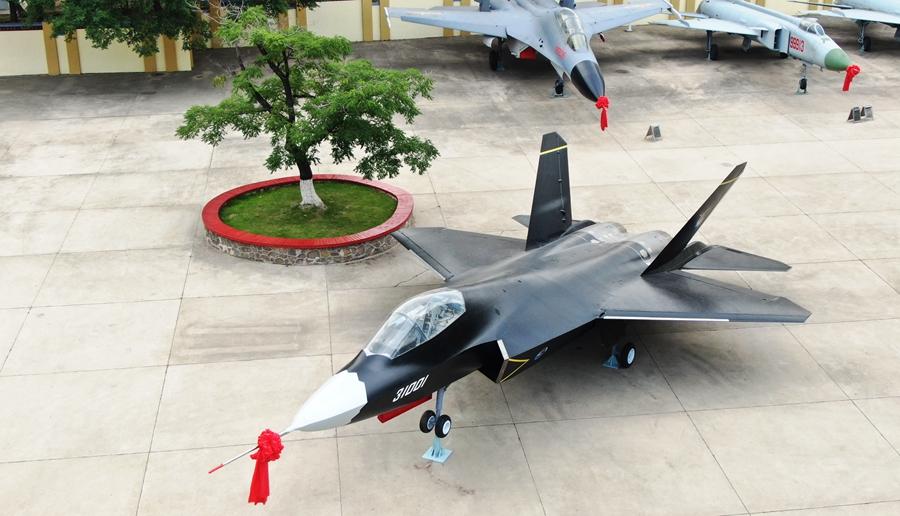 這是2021年6月24日在航空工業(yè)沈飛航空博覽園拍攝的“鶻鷹”戰(zhàn)機(jī)(無人機(jī)照片)。新華社記者 楊青 攝