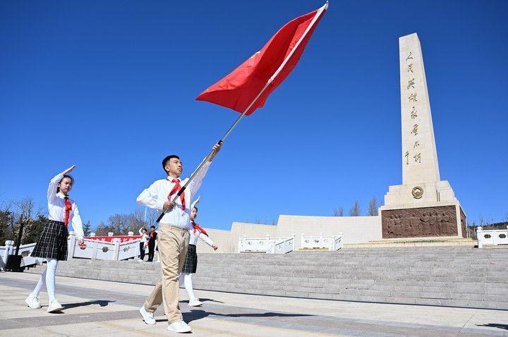 這是2025年4月2日在內(nèi)蒙古呼和浩特市大青山紅色文化公園拍攝的中國(guó)少年先鋒隊(duì)出旗儀式。