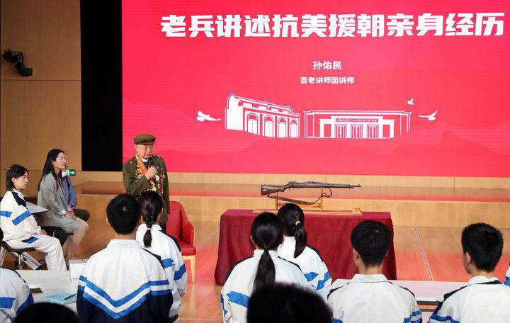 2021年10月25日,老兵代表在上海中學(xué)的課堂上講述抗美援朝的親身經(jīng)歷。這堂特別的思政課是中共一大紀(jì)念館“百物進(jìn)百校,百講證百年”活動(dòng)的第一講,紀(jì)念館從館藏中精選100件革命文物,帶進(jìn)學(xué)校課堂,以“文物進(jìn)校園”的形式,用好用活紅色資源,賡續(xù)紅色血脈。