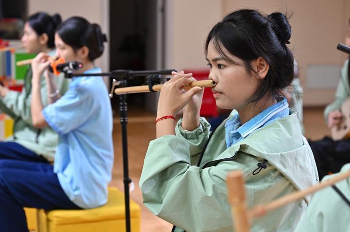 2025年6月12日,海南省民族技工學(xué)校學(xué)生在練習(xí)黎族鼻簫。近年來(lái),海南省五指山市打造“非遺進(jìn)校園”工程,在14所公辦中小學(xué)開設(shè)非遺課程,培養(yǎng)青少年對(duì)中華優(yōu)秀傳統(tǒng)文化的熱愛(ài),助力非遺傳承與發(fā)展。