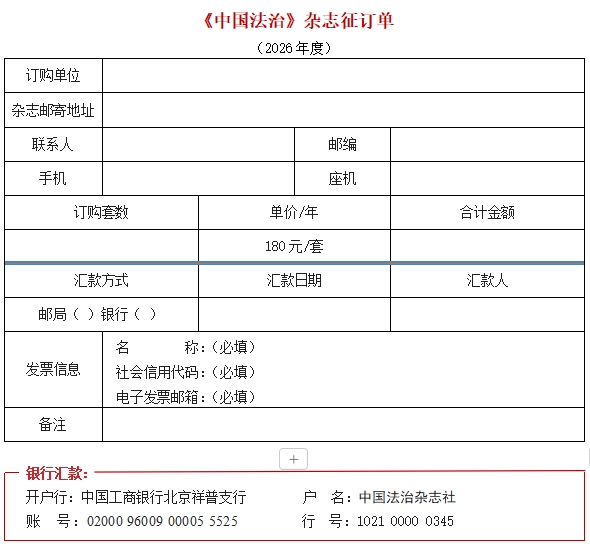 ★匯款時請務必標明“中國法治+訂購套數(shù)”,個人匯款另需注明“單位名稱”。